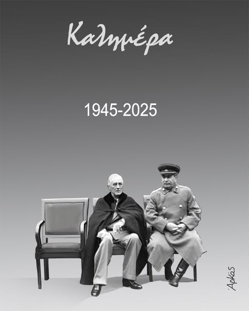 Ωστόσο, στο εν λόγω σκίτσο λείπει η μία εκ των τριών δυνάμεων που πήραν μέρος στη διάσκεψη της Γιάλτας που έγινε πριν 80 χρόνια και συγκεκριμένα το 1945. Η Βρετανία, που την εκπροσωπούσε τότε ο πρωθυπουργό της Ουίνστον Τσόρτσιλ, είναι απούσα κι αυτό γιατί πλέον, σύμφωνα με τον γνωστό σκιτσογράφο, δύο είναι πλέον οι δυνάμεις.