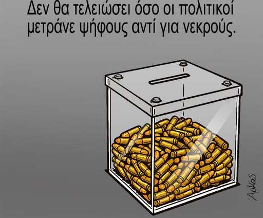 Ο γνωστός σκιτσογράφος θέλοντας να σχολιάσει με τον δικό του καυστικό τρόπο τα όσα συμβαίνουν τις τελευταίες μέρες σε τοπικές κοινωνίες, δημιούργησε μία κάλπη γεμάτη σφαίρες. Ο σκιτσογράφος που συνηθίζει και θίγει θέματα της επικαιρότητας που απασχολούν, γέμισε την κάλπη όχι με ψηφοδέλτια αλλά με σφαίρες ενώ η λεζάντα αναφέρει: «Δεν θα τελειώσει όσο οι πολιτικοί μετράνε ψήφους αντί για νεκρούς».