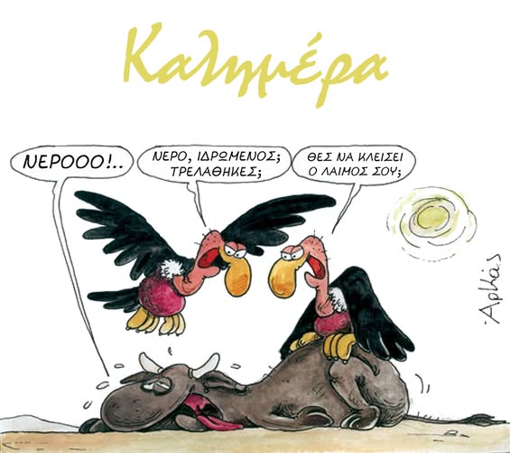 Με… γρίφους καλημερίζει τους διαδικτυκούς του φίλους ο γνωστός σκιτσογράφος. Ο Αρκάς στη σημερινή του δημοσίευση αποτυπώνει δύο κοράκια να βρίσκονται πάνω από το μελλοντικό τους θύμα που πνέει τα λοίσθια. Όταν εκείνο τους ζητάει νερό λίγο πριν… σβήσει, εκείνα του λένε ότι δεν μπορούν να του δώσουν τώρα που είναι ιδρωμένο γιατί θα τον πιάσει ο λαιμός του!