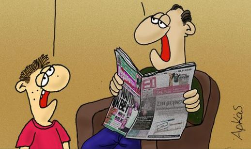 Ο γνωστός σκιτσογράφος μέσα από τη σελίδα του facebook κάνει ξεκάθαρο το νόημα της αντισυστημικής ψήφου. Για την ακρίβεια, ο παιδάκι ρωτάει τον πατέρα του: «Μπαμπά τι είναι η αντισυστημική ψήφος;» και εκείνος του απαντά: «Είναι όπως στο τσίρκο: Οταν το κοινό αρχίζει να δυσανασχετεί, βγαίνουν οι κλόουν».