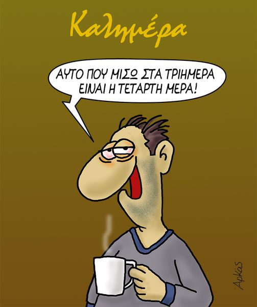Ο Αρκάς στέλνει και σήμερα, μετά από ένα τριήμερο ανάπαυσης, την καλημέρα του παραδεχόμενος μία αλήθεια. Ο κύριος, αγουροξυπνημένος και… αξύριστος, λέει ότι αυτό που μισεί στα τριήμερα, είναι φυσικά η τέταρτη μέρα!