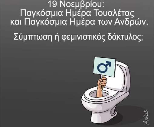 Με χιουμοριστικό τρόπο επέλεξε να καλημερίσει σήμερα (19/11) ο γνωστός σκιτσογράφος. Έχοντας μία τουαλέτα μέσα από την οποία βγαίνει ένα χέρι που κρατά ένα πλακάτ με το σύμβολο του άρρεν, υπενθυμίζει ότι σήμερα είναι η παγκόσμια ημέρα τουαλέτας και ταυτόχρονα, η παγκόσμια ημέρα των ανδρών. Πρόκειται άραγε για σύμπτωση ή είναι ένας φεμινιστικός… δάκτυλος;