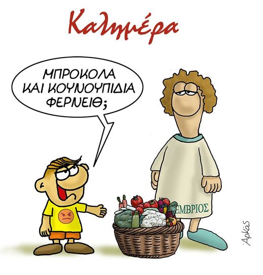 Στο σκίτσο, ο Θανασάκης βλέπει το καλάθι του Νοεμβρίου που είναι γεμάτο με μπρόκολα, κουνουπίδια, πιπεριές και καρότα ( όλα αυτά που ο μικρός ήρωας αντιπαθεί) και λέει με έντονη δυσαρέσκεια στον μήνα: «Μπρόκολα και κουνουπίδια φέρνειθ;».