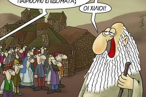 Ο γνωστός σκιτσογράφος, που συνηθίζει να καυτηριάζει τα… κακώς κείμενα, στη σημερινή (28/11) του καλημέρα εμφανίζει τον προφήτη να μιλάει στους κατοίκους τονίζοντας ότι το μόνο που τους ενδιαφέρει είναι να ψάχνουν τρόπους να τους επιδοτεί το κράτος. Τότε εκείνοι παραπονιούνται λέγοντας ότι τους αδικεί και τον ρωτούν αν ξέρει πόσοι από τους πεντακόσιους κατοίκους του χωριού παίρνουν επιδόματα. Τότε ακριβώς έρχεται και η… πληρωμένη απάντηση!