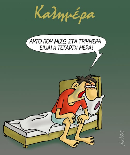 Τη δυσκολία που καλείται να διαχειριστεί κάποιος μετά το τριήμερο μας υπενθυμίζει με το σημερινό του σκίτσο ο γνωστός Αρκάς. Συγκεκριμένα, στη σημερινή του καλημέρα μετά το τριήμερο της Καθαράς Δευτέρας, δείχνει έναν αγουροξυπνημένο και ελαφρώς… αξύριστο κύριο να εξηγεί τι μισεί περισσότερο στα τριήμερα.