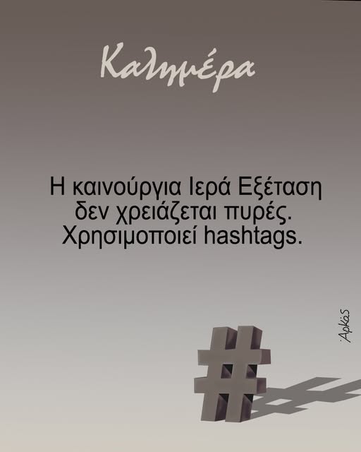 Με το νέο είδος Ιεράς Εξέτασης που ακούει στο όνομα hashtag καλημερίζει το κοινό του ο γνωστός σκιτσογράφος. Κι εκεί που κάποτε υπήρχε το εν λόγω δικαστήριο, τώρα έχει αντικατασταθεί από το λαϊκό δικαστήριο του διαδικτύου.