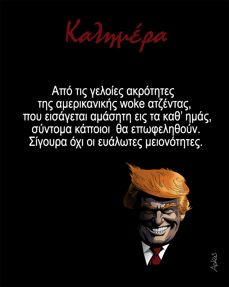 Ο Αρκάς στέλνει και σήμερα την καλημέρα με αλήθειες. Στο σημερινό του σκίτσο πρωταγωνιστής είναι ο Ντόναλτ Τραμπ, ο οποίος φέρνει και λίγο με το χαμόγελο του στον Τζόκερ. Στο κείμενο που συνοδεύει την γελοιογραφία ο Αρκάς γράφει: Από τις γελοίες ακρότητες της αμερικανικής woke ατζέντας, που εισάγεται αμάσητη εις τα τα καθ ημάς, σύντομα κάποιοι θα επωφεληθούν. Σίγουρα όχι οι ευάλωτες μειονότητες.