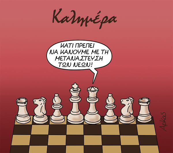 Φανερά… προβληματισμένη εμφανίζεται η βασίλισσα στο σκάκι, που απευθυνόμενη στο βασιλιά του αναφέρει πως κάτι πρέπει να κάνουν για τη μετανάστευση των νέων.