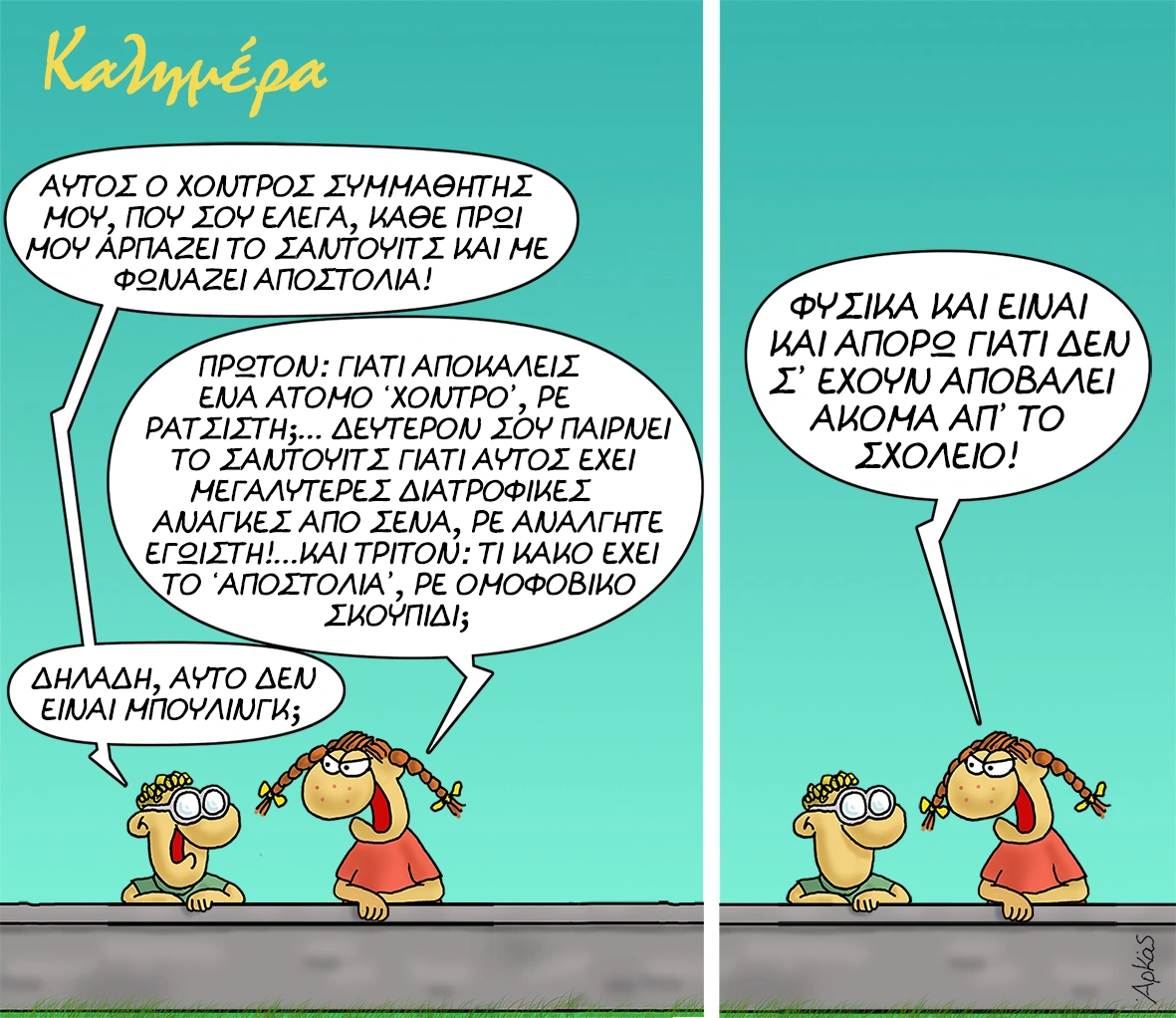 Μια καλημέρα απο Αρκά όλο νόημα, καθώς την προηγουμένη εβδομάδα ξεκίνησε η σχολική χρονιά και έτσι παρουσιάζει ένα διάλογο για τον σχολικό εκβιασμό ή αλλιώς μπούλινγκ.