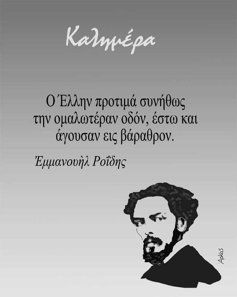 Και στη σημερινή του καλημέρα μέσα από το σκίτσο του στο facebook ο γνωστός σκιτσογράφος αναφέρεται στα αποφθέγματα του λογοτέχνη και δοκιμιογράφου Εμμανουήλ Ροΐδη.