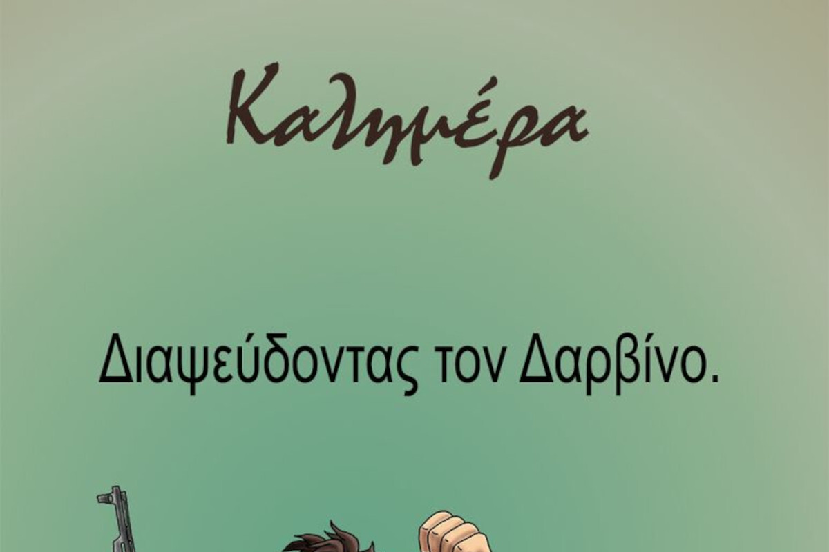 Ο γνωστός σκιτσογράφος εύχεται «Καλημέρα» και στο σκίτσο του αναφερόμενος στη θεωρία του Δαρβίνου τη διαψεύδει δείχνοντας έναν… άνθρωπο των σπηλαίων που κρατά ένα όπλο να πατά με το πόδι του μία ημίγυμνη γυναίκα.