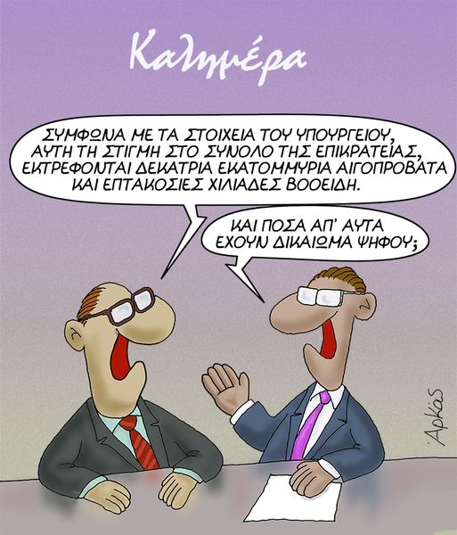 Ο Αρκάς μας λέει καλημέρα με ένα σκίτσο όλο νόημα αφού δύο υπουργικά στελέχη συζητούν για τον αριθμό αιγοπροβάτων με τον έναν από αυτούς να αναρωτιέται πόσα από τα πρόβατα έχουν δικαίωμα ψήφου.
