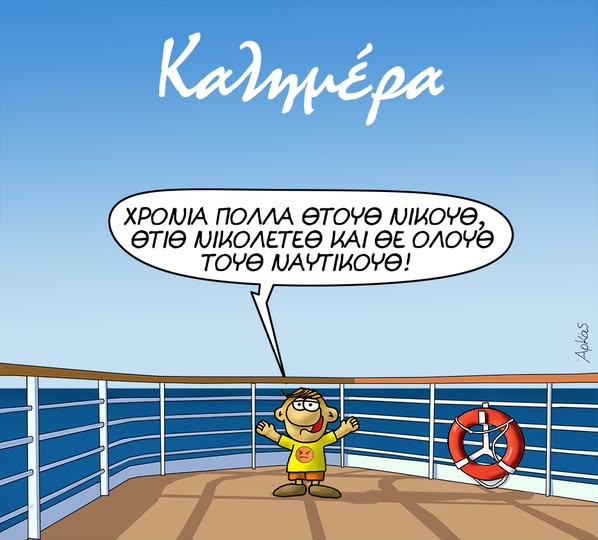 Ο γνωστός σκιτσογράφος χρησιμοποιεί το χαριτωμένο πιτσιρικά, Θανασάκη για να στείλει μία εορταστική καλημέρα στους Νίκους, τις Νικολέτες και όλους τους ναυτικούς.