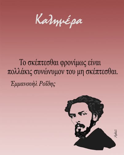 Στο σημερινό σκίτσο βλέπουμε μια προσωπογραφία του λογοτέχνη και δοκιμιογράφου Εμμανουήλ Ροΐδη να λέει: «Το σκέπτεσθαι φρονίμως είναι πολλάκις συνώνυμον του μη σκέπτεσθαι».