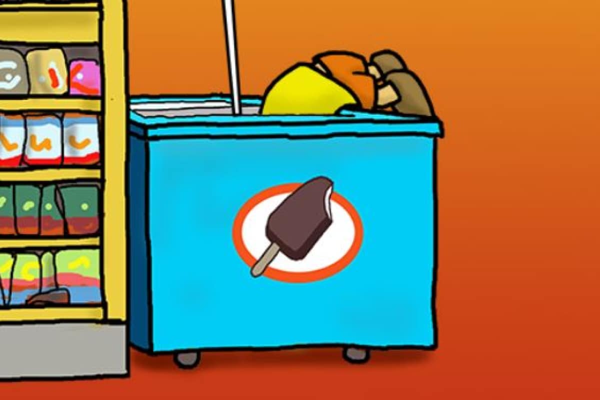 Ο μικρός, μην αντέχοντας άλλο τη ζέστη βρίσκει μια όαση δροσιάς μέσα στο ψυγείο με τα παγωτά, στο περίπτερο. Και όταν τον ρωτά ο περιπτεράς τι ψάχνει πάλι, εκείνος απαντά με ειλικρίνεια ότι δροθίδεται!