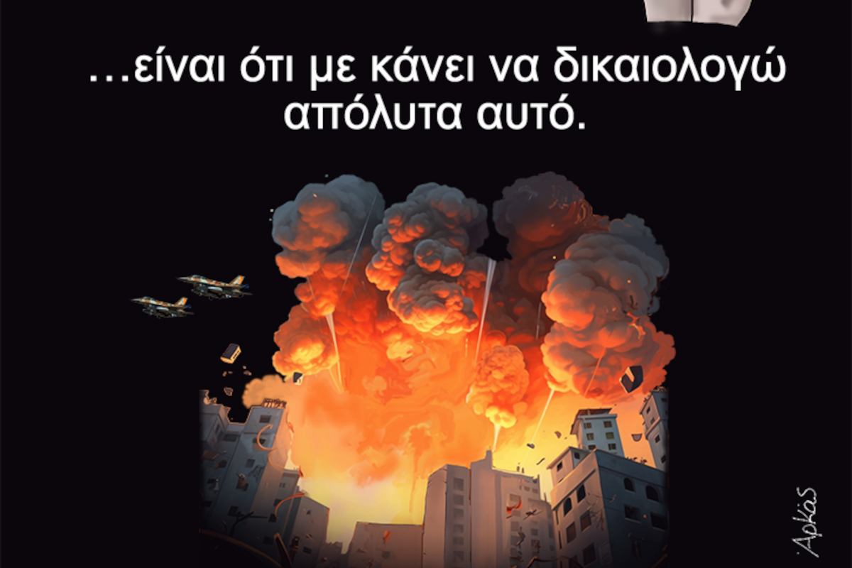 Το σκίτσο του Αρκά, το οποίο απεικονίζει τη φιγούρα μίας γυναίκας δεμένης πισθάγκωνα και εμφανώς κακοποιημένης με τη λεζάντα «Εκείνο που μισώ πιο πολύ στην κτηνωδία…» που ακολουθείται από την εικόνα αεροπορικών βομβαρδισμών με τη λεζάντα: «… είναι ότι με κάνει να δικαιολογώ απόλυτα αυτό»….