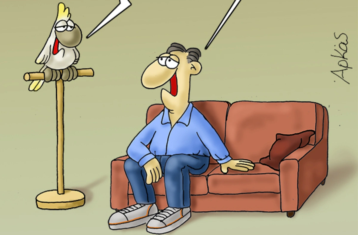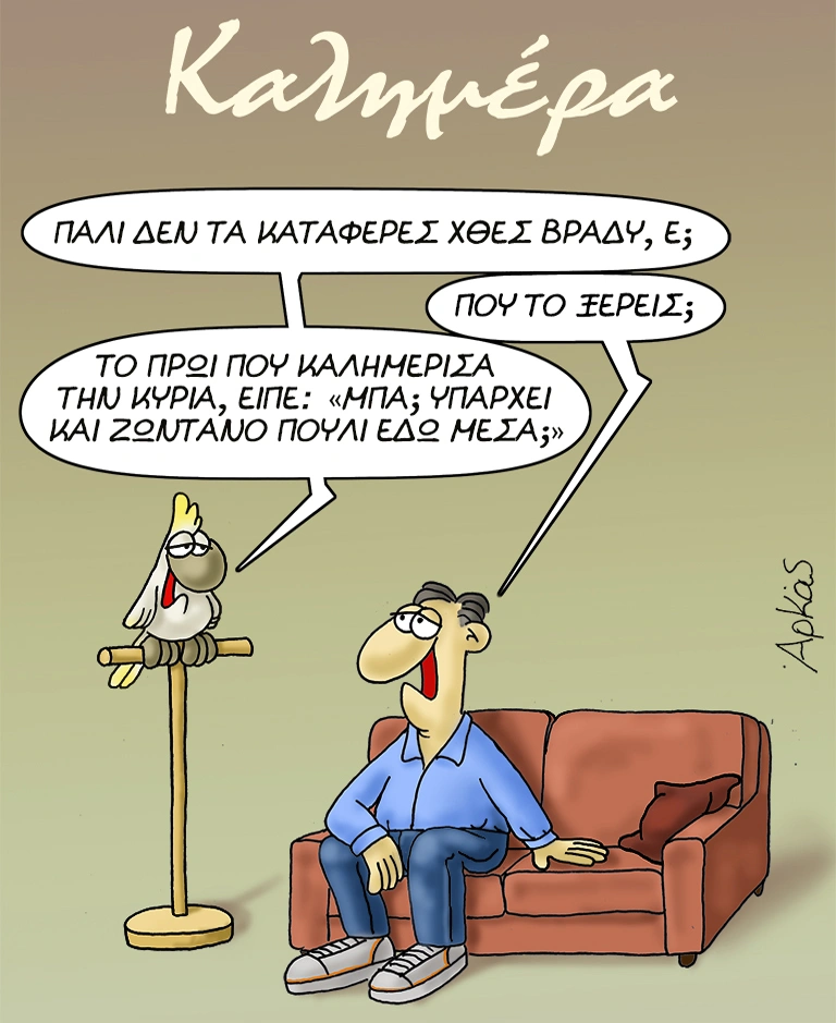 Στο σκίτσο του, ο Αρκάς παρουσιάζει έναν άνδρα να κάθεται στον καναπέ του σπιτιού του και να συζητά με ένα πουλί παπαγάλο με την συζήτηση να γυρνά γύρο από το σεξ και τις επιδόσεις του άνδρα στο κρεβάτι.