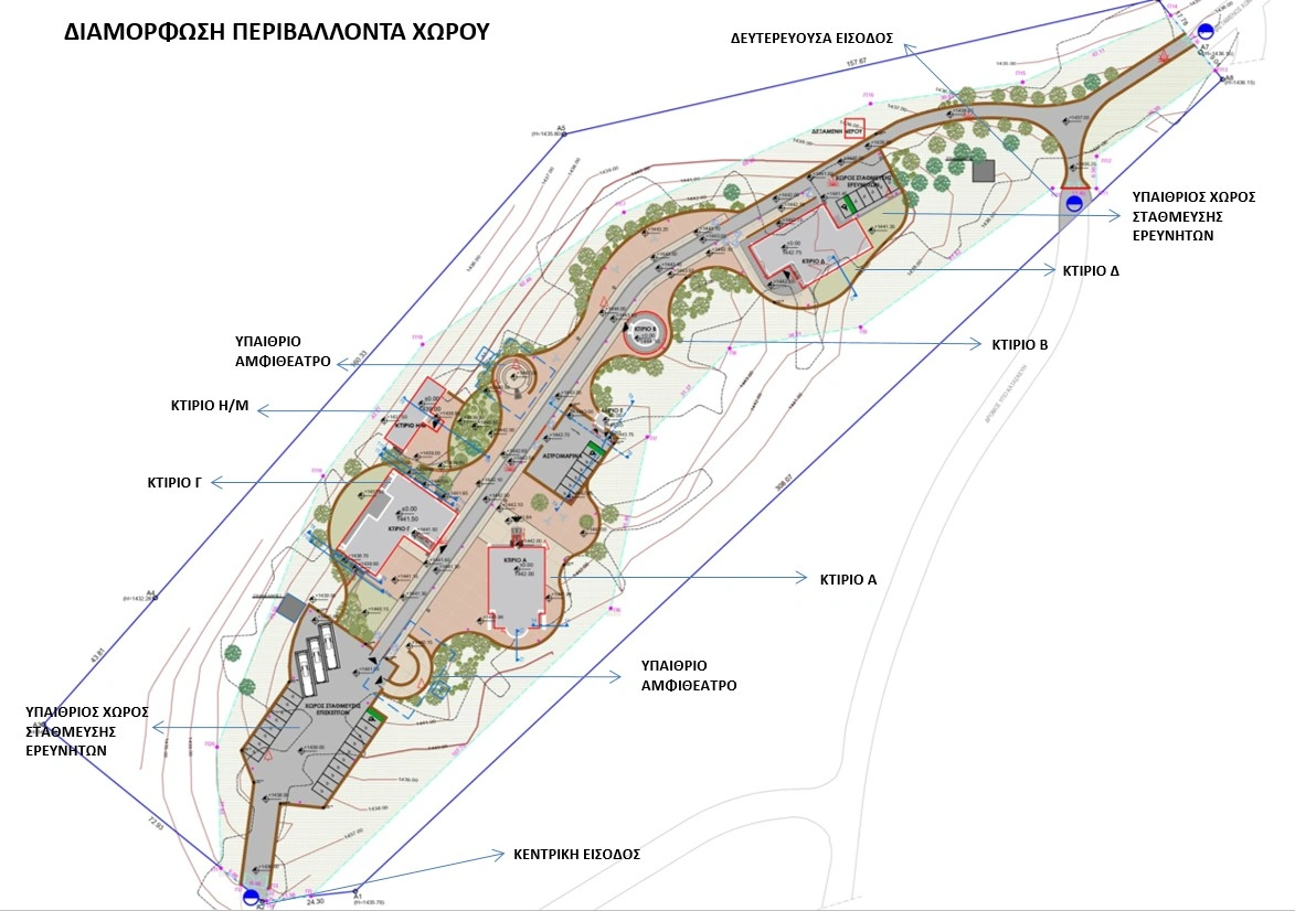 Ο περιβάλλων χώρος έχει σχεδιαστεί ώστε να ενσωματώνεται στο φυσικό τοπίο, με χαμηλή φύτευση, οργανικά καθιστικά, υπαίθρια αμφιθέατρα, ράμπες προσβασιμότητας, διαδρομές για ΑμεΑ και υδατοδιαπερατά υλικά που βελτιώνουν το μικροκλίμα. Η συνολική διάταξη των κτιρίων και των διαδρομών εξασφαλίζει λειτουργικότητα, προσβασιμότητα και αισθητική συνοχή. Το Πάρκο αναμένεται να λειτουργήσει και ως μοχλός ανάπτυξης για τα Γρεβενά και τη Δυτική Μακεδονία. Η δυνατότητα φιλοξενίας εκπαιδευτικών προγραμμάτων, θερινών σχολείων, δράσεων διάχυσης της επιστήμης και επισκέψεων σχολείων δημιουργεί ένα νέο πεδίο δραστηριοτήτων που μπορεί να ενισχύσει την τοπική οικονομία και να αναβαθμίσει το προφίλ της περιοχής. Παράλληλα, η ύπαρξη εξειδικευμένων τηλεσκοπίων και σύγχρονων υποδομών ανοίγει τον δρόμο για συμμετοχή σε διεθνή ερευνητικά δίκτυα.