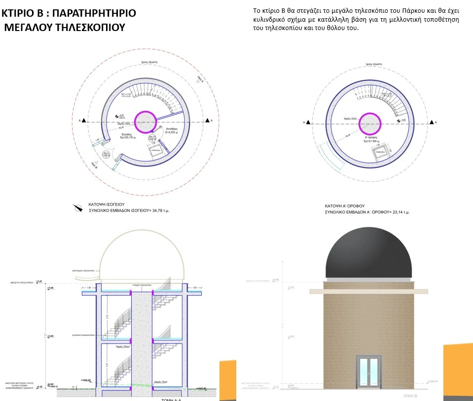Στον πυρήνα του έργου βρίσκονται τα εξειδικευμένα κτίρια. Το Κτίριο Α, το Εκπαιδευτικό Κέντρο, θα στεγάζει το εκπαιδευτικό τηλεσκόπιο, το παρατηρητήριο, αμφιθέατρο και δύο εργαστήρια, μαζί με χώρους υγιεινής και υποδομές για μελλοντικές αναβαθμίσεις. Το Κτίριο Β θα φιλοξενεί το μεγάλο τηλεσκόπιο του Πάρκου, με κυλινδρική μορφή και ειδική βάση για τον θόλο παρατήρησης. Το Κτίριο Γ, πολυλειτουργικό και αναπτυγμένο σε δύο επίπεδα, θα περιλαμβάνει μουσείο, ηλιακό σταθμό, αποθηκευτικούς χώρους, κυλικείο, αίθουσες, εργαστήρια και την κατοικία του φύλακα. Το Κτίριο Δ προορίζεται αποκλειστικά για ερευνητές και προσωπικό, με αίθουσα ελέγχου τηλεσκοπίου, εργαστήρια, γραφεία και χώρους ενδιαίτησης. Το Κτίριο Ε θα στεγάζει το τηλεσκόπιο επισκόπησης ουρανού, με ειδική υάλινη οροφή που επιτρέπει απρόσκοπτη παρατήρηση, ενώ το Κτίριο Η/Μ θα εξυπηρετεί τις τεχνικές ανάγκες του συνόλου.