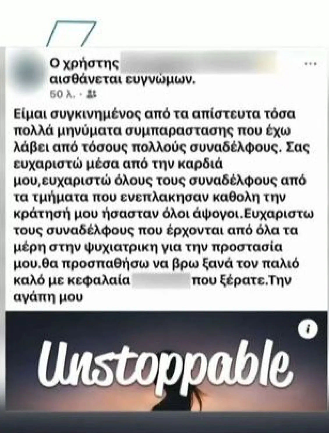 «Είμαι συγκινημένος από τα απίστευτα τόσα πολλά μηνύματα συμπαράστασης που έχω λάβει από τόσους πολλούς συναδέλφους. Σας ευχαριστώ μέσα από την καρδιά μου, ευχαριστώ όλους τους συναδέλφους από τα τμήματα που ενεπλάκησαν καθόλη την κράτησή μου, ήσασταν όλοι άψογοι. Ευχαριστώ τους συναδέλφους που έρχονται από όλα τα μέρη στην ψυχιατρική για την προστασία μου. Θα προσπαθήσω να βρω ξανά τον παλιό καλό με κεφαλαία… που ξέρατε. Την αγάπη μου», γράφει ο αστυνομικός, προκαλώντας μέσα από το νοσοκομείο, όπως αποκάλυψε η εκπομπή «Το Πρωινό» στον ΑΝΤ1.