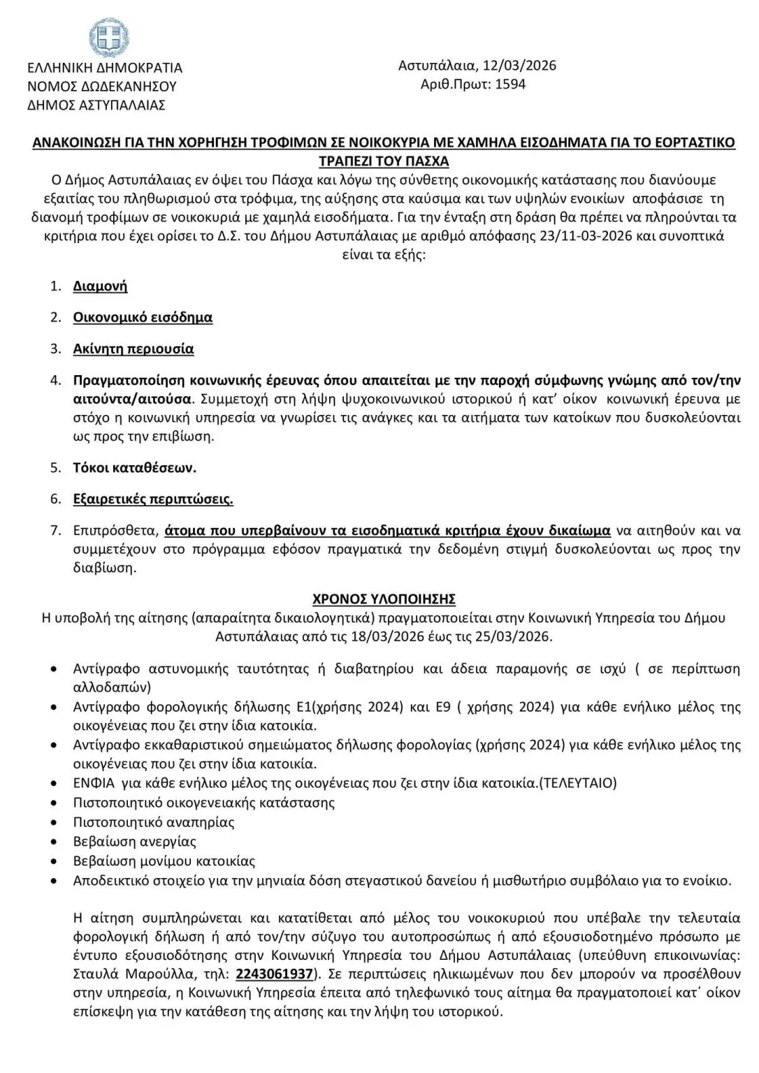 Η υποβολή των αιτήσεων, μαζί με τα απαραίτητα δικαιολογητικά, θα γίνεται στην Κοινωνική Υπηρεσία του Δήμου Αστυπάλαιας από τις 18 έως τις 25 Μαρτίου 2026.