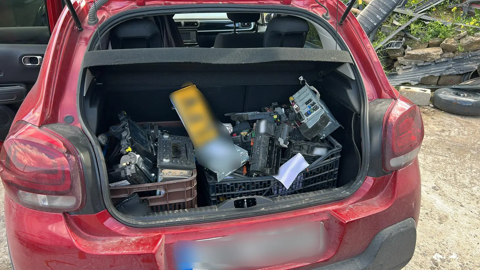 πλήθος κινητών τηλεφώνων και σετ αποτελούμενο από πινακίδες κυκλοφορίας, sticker τεχνικών προδιαγραφών, μεταλλικό κομμάτι με τον εγχάρακτο αριθμό πλαισίου, εγκέφαλο αυτοκινήτου και δύο κλειδιά οχημάτων.
