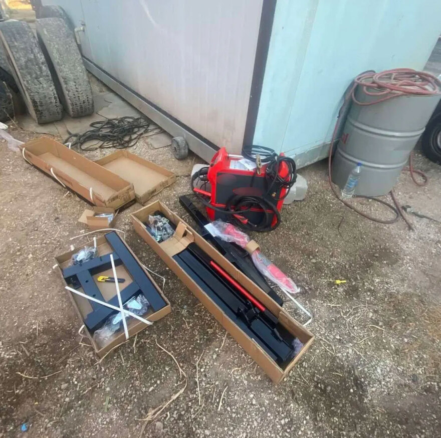- -4- κινητά και εξοπλισμός και μηχανήματα της εταιρείας παροχής υπηρεσιών μεταφορών (γερανός, τροχός, μηχάνημα ηλεκτροκόλλησης, εργαλεία κ.α.).