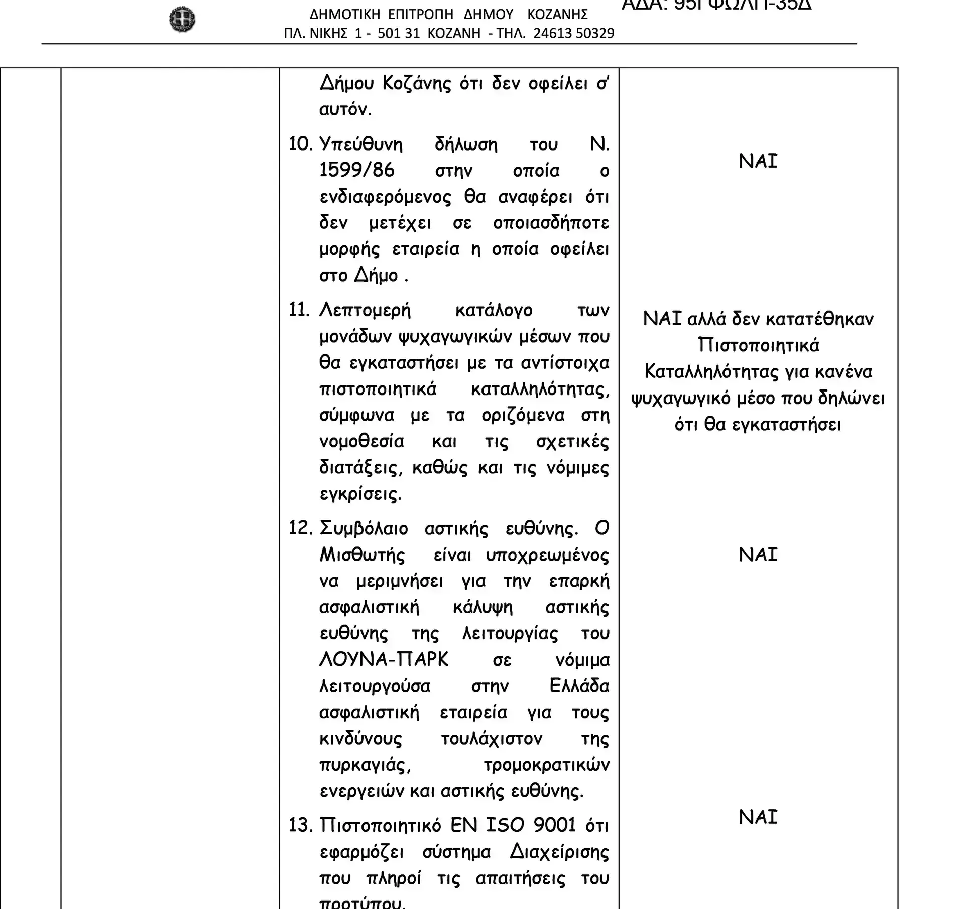 Η μία διαγωνιζόμενη συμμετείχε εξουσιοδοτώντας τον 58χρονο επιχειρηματία του μοιραίου λούνα παρκ που λειτουργούσε στο Πευκοχώρι. Σύμφωνα με τη σχετική ανάρτηση στη «Διαύγεια», η συμμετοχή τους ακυρώθηκε διότι «δεν κατατέθηκαν πιστοποιητικά καταλληλότητας για κανένα ψυχαγωγικό μέσο που δηλώνει ότι θα εγκαταστήσει». Κοντολογίς, ο 58χρονος δεν είχε τα σχετικά έγγραφα για να μπορεί να λειτουργήσει λούνα παρκ. Αξίζει να αναφερθεί ότι και ο δεύτερος διαγωνιζόμενος αποκλείστηκε για τον ίδιο ακριβώς λόγο (!), με αποτέλεσμα ο δήμος Κοζάνης να προχωρήσει στην επαναπροκήρυξη της προφορικής πλειοδοτικής δημοπρασίας.