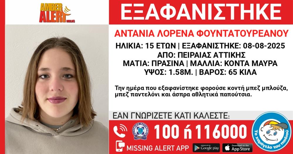 Το Χαμόγελο του Παιδιού ενημερώθηκε σήμερα, 12/08/2025 για την εξαφάνιση και άμεσα προχώρησε στην ενεργοποίηση του μηχανισμού AMBER ALERT HELLAS, κατόπιν εισαγγελικής εντολής, καθώς συντρέχουν λόγοι που θέτουν τη ζωή της σε κίνδυνο. Η Αντάνια-Λορένα Φουνταντουρεάνου, 15 ετών έχει ύψος 1,58 μ., έχει βάρος 65 κιλά, έχει κοντά μαύρα μαλλιά και πράσινα μάτια. Την ημέρα που εξαφανίστηκε φορούσε κοντή μπεζ μπλούζα, μπεζ παντελόνι και άσπρα αθλητικά παπούτσια.
