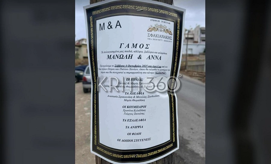Όπως αναφέρει το kriti360, το γραφείο τελετών Σφακιανάκη στα Χανιά έβγαλε αγγελτήριο γάμου σε κηδειόχαρτο! Φυσικά δεν το έκανε για κάποιον πελάτη, καθώς γαμπρός είναι ο γιος του ιδιοκτήτη του γραφείου τελετών, Γιάννη Σφακιανάκη, Μανώλης, ο οποίος παντρεύεται την εκλεκτή της καρδιάς του, Άννα.