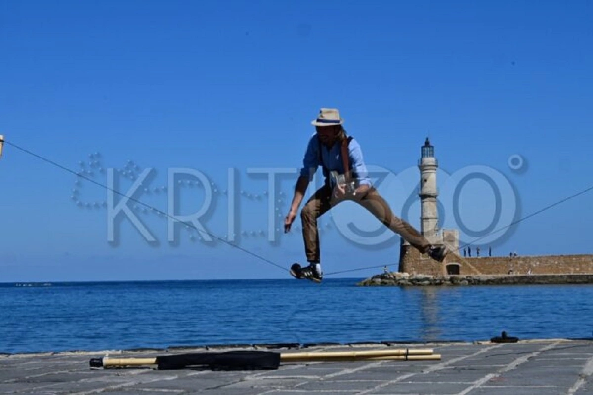 Με το στόμα ανοιχτό έμειναν όσοι συνάντησαν σήμερα το πρωί στο Ενετικό Λιμάνι Χανίων έναν ταλαντούχο καλλιτέχνη, ο οποίος με φόντο το αιγυπτιακό φάρο έπαιζε μουσική και τραγουδούσε πάνω σε ένα τεντωμένο σχοινί.