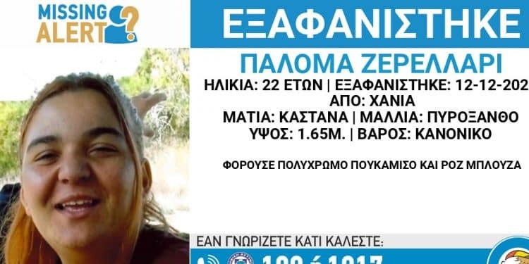 Η 22χρονη Παλόμα Ζερελλάρι έφυγε από το σπίτι της στα Χανιά στις 12 Δεκεμβρίου και μία ημέρα αργότερα φέρεται να έστειλε μήνυμα σε μία γειτόνισσα ότι κλέφτηκε με έναν άνδρα, όπως αναφέρει το cretapost.gr.