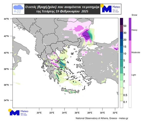 Στους χάρτες 1 και 2 παρουσιάζονται οι βροχοπτώσεις που αναμένονται το μεσημέρι και τις πρώτες βραδινές ώρες της Τετάρτης 19/02. Με πράσινες αποχρώσεις σημειώνονται οι βροχοπτώσεις που αναμένεται ως βροχή ενώ με μοβ ο υετός που αναμένεται ως χιόνι.