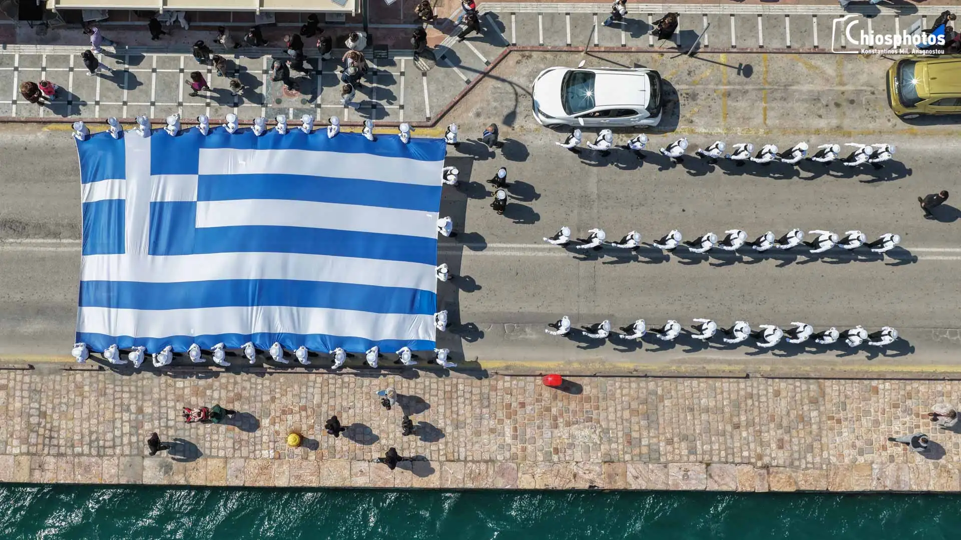 Η εντυπωσιακή σε μέγεθος Ελληνική Σημαία έφτασε για τον εορτασμό της 25ης Μαρτίου στο νότιο λιμενοβραχίονα συνοδευόμενη από πομπή σπουδαστών της ΑΕΝ Μηχανικών Χίου υπό τα εμβατήρια της Φιλαρμονικής του Δήμου.