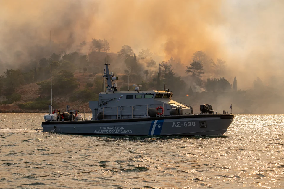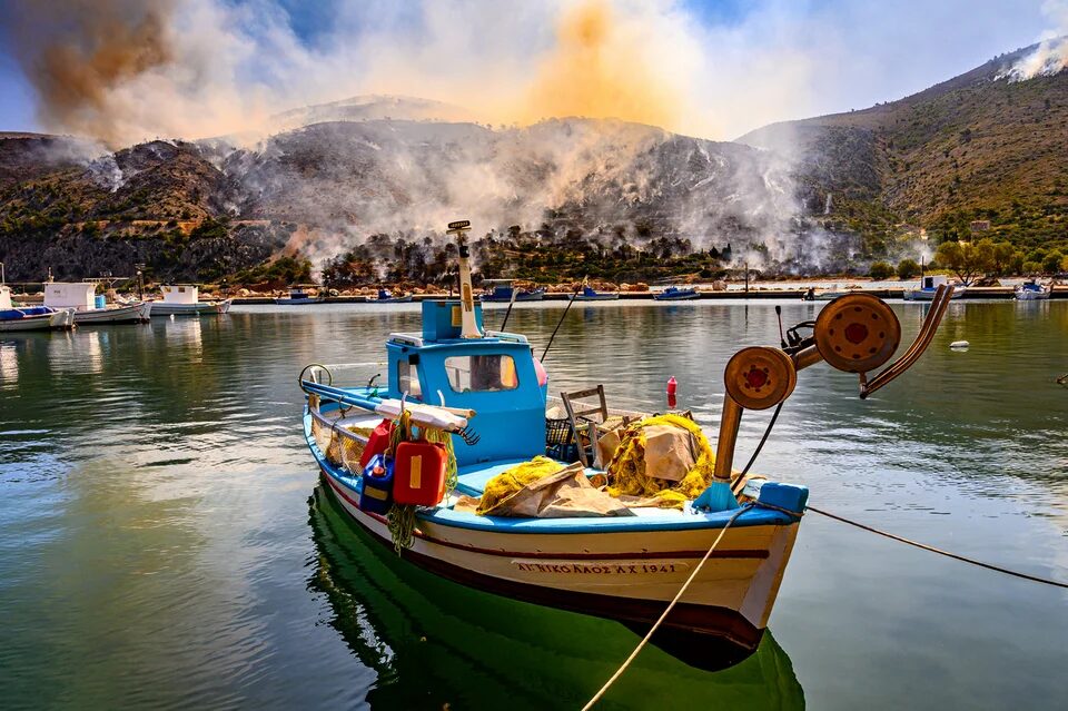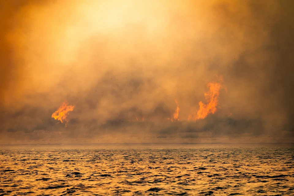 Ο φωτογράφος του ΑΠΕ-ΜΠΕ Κώστας Κουργιάς απαθανάτισε με τον φακό του την πυρκαγιά μέσα από τη θάλασσα στη δυτική πλευρά του νησιού, όταν την Τρίτη οι φλόγες έφτασαν κοντά στον οικισμό Λιθί.