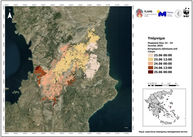 Όπως φαίνεται από τον χάρτη εξάπλωσης της πυρκαγιάς, που συμπεριλαμβάνεται στην προκαταρκτική ανάλυση που έκαναν από κοινού η πυρομετεωρολογική ομάδα FLAME της μονάδας ΜΕΤΕΟ του Εθνικού Αστεροσκοπείου Αθηνών και η WWF Ελλάς, η μεγαλύτερη ζημιά έγινε τη Δευτέρα 23 Ιουνίου, όταν κάηκαν 29.000 στρέμματα.