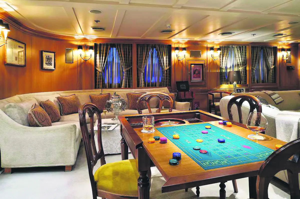 Στο εσωτερικό του, κάθε λεπτομέρεια είχε σχεδιαστεί για να εντυπωσιάζει. Το διάσημο μπαρ «Αρης» διακοσμήθηκε με δόντια φάλαινας σκαλισμένα με σκηνές από την Οδύσσεια, ενώ τα σκαμπό κατασκευάστηκαν από δέρμα φάλαινας. Το ξύλο του μπαρ προερχόταν από πειρατικό πλοίο του 17ου αιώνα. Παράλληλα, η πισίνα, με το εντυπωσιακό ψηφιδωτό του Μινώταυρου, μπορούσε να μετατραπεί σε πίστα χορού με το πάτημα ενός κουμπιού.