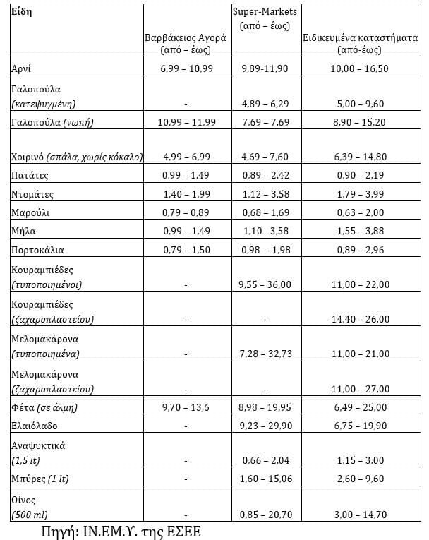 Σημειώνεται πως το εύρος των τιμών δικαιολογείται από την καταγραφή σειράς προϊόντων διαφορετικής ποιότητας, σε αρκετές τοπικές αγορές και διαφορετικούς τύπους καταστημάτων. Επιπρόσθετα, διευκρινίζεται ότι οι τιμές των προϊόντων είναι ενδεικτικές και επιχειρούν να χαρτογραφήσουν τη γενική κατανομή τιμών και την εικόνα της αγοράς.
