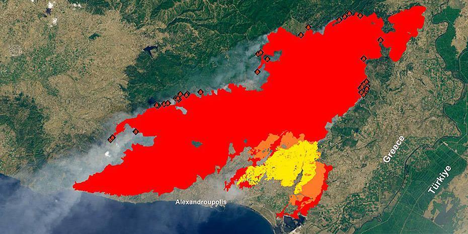 Our #RapidMappingTeam has delivered its 2⃣nd Monitoring Product for the large #wildfire burning in East Macedonia and Thrace Region