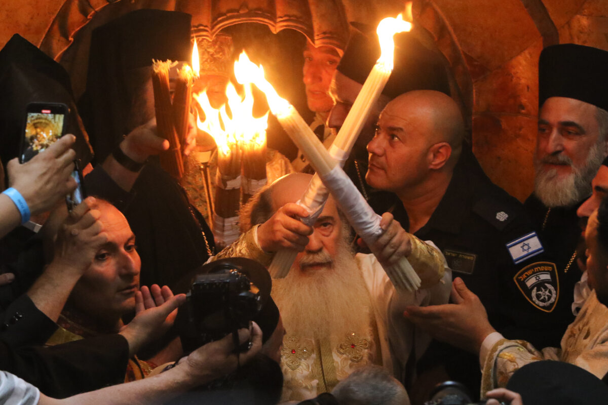 Ο Πατριάρχης, ακολουθώντας το αυστηρό τελετουργικό, εξήλθε από τον Πανάγιο Τάφο κρατώντας τις 33 λαμπάδες, μία για κάθε έτος της επίγειας ζωής του Χριστού.