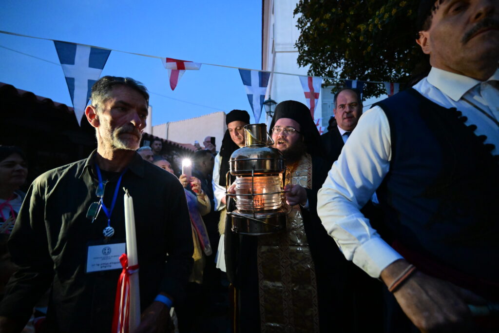 O έξαρχος του Παναγίου Τάφου στην Αθήνα, αρχιμανδρίτης Ιερώνυμος, χαρακτήρισε «τρόπαιον της του Χριστού νίκης» το ‘Αγιο Φως, «εκ του Παναγίου και Ζωοδόχου Τάφου, εκ του Πανιέρου Ναού της Αναστάσεως, εκ της αγίας πόλεως της Ιερουσαλήμ» και απηύθυνε τον εόρτιο πασχάλιο χαιρετισμό «Χριστός Ανέστη». Επίσης, μεταξύ άλλων, ανέφερε ότι έχει την τιμή και την ευλογία να μεταφέρει τις πατρικές ευχές και τις πατριαρχικές ευλογίες του Πατριάρχη Θεοφίλου του Γ’ και όλων των μελών της αγιοταφικής αδελφότητος, «οι οποίοι δίδουν τη μαρτυρία τους σε μια παραμεθόριο του Ελληνισμού, της Ορθοδοξίας και της Ρωμιοσύνης». Εν συνεχεία, παρακάλεσε να μην ξεχάσουμε το βράδυ που θα γιορτάσουμε τη Θεία Ανάσταση στις εκκλησίες μας και να λάβουμε το ‘Αγιο Φως, να ανάψουμε ένα κερί «για τη Μητέρα των Εκκλησιών, για τους χριστιανούς μας της Μέσης Ανατολής, οι οποίοι δεινοπαθούν και οι οποίοι ελπίζουν στην πατρίδα μας και στη μεγαλόνησο Κύπρο, για να συνεχιστεί η διακονία της αγιοταφικής αδελφότητας στους Αγίους Τόπους και να μπορούμε να μεταβαίνουμε προσκυνηματικώς, και να αγιαζόμεθα και να ευλογούμεθα».