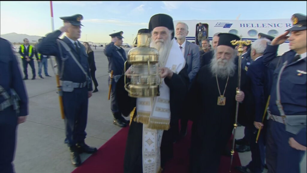 Αφίχθηκε στην Αθήνα με το κυβερνητικό αεροσκάφος το ‘Αγιο Φως, λίγες ώρες μετά την τελετή Αφής του στα Ιεροσόλυμα. Το αεροσκάφος προσγειώθηκε στις 19.30 στο αεροδρόμιο «Ελευθέριος Βενιζέλος» και ύστερα από μια σύντομη τελετή μεταφέρθηκε στο μετόχι του Παναγίου Τάφου στην Πλάκα, όπου πλήθος πιστών περιμένει με κεριά και φαναράκια στα χέρια για να πάρει το Αναστάσιμο ‘Αγιο Φως από τα χέρια του αρχιμανδρίτη Ιερώνυμου.