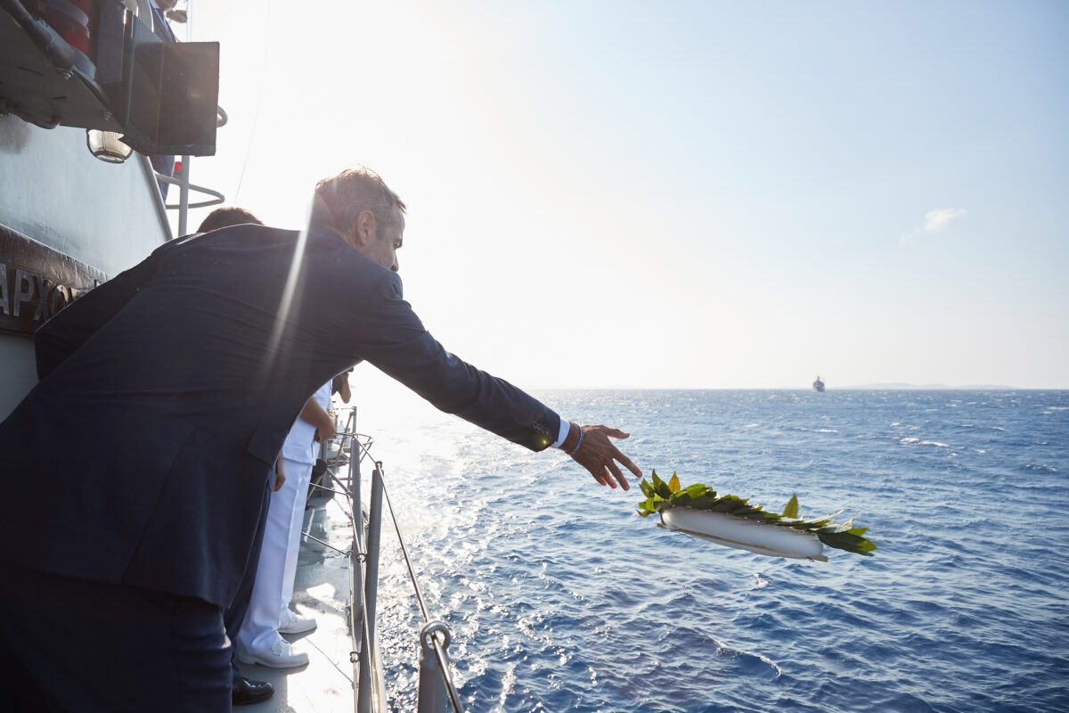 Συνοδευόμενος, επίσης, από τον Αρχηγό ΓΕΕΘΑ Στρατηγό Κωνσταντίνο Φλώρο, ο κ. Μητσοτάκης επιβιβάστηκε σε πυραυλάκατο (ΤΠΚ) του Πολεμικού Ναυτικού για την επιμνημόσυνο δέηση στο σημείο που βυθίστηκε το «Έλλη», όπου έριξε στεφάνι στη θάλασσα για να τιμήσει τους άνδρες του καταδρομικού που έδωσαν τη ζωή τους για την πατρίδα.