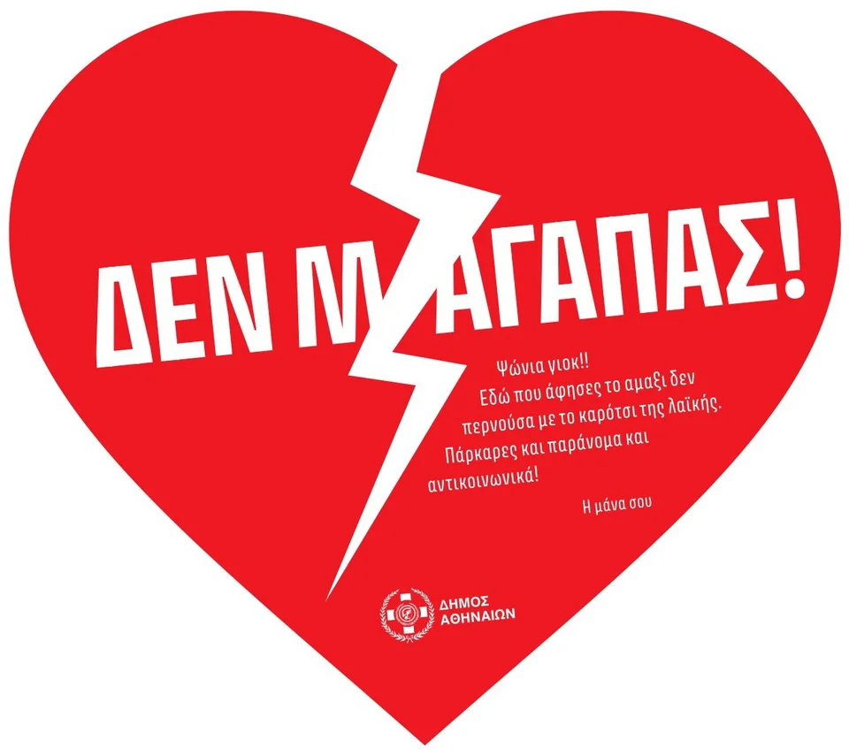 Κλιμάκια της Δημοτικής Αστυνομίας μαζί με τον δήμαρχο Αθηναίων Χάρη Δούκα, μοίρασαν κλήσεις σήμερα το πρωί στους παραβάτες, αλλά και μια κόκκινη ραγισμένη καρδιά μ’ ένα κοινωνικό μήνυμα, ανημερα του Αγίου Βαλεντίνου, και με τίτλο «Δεν μ’ αγαπάς», στα οχήματα εκείνων που είχαν διπλοπαρκάρει, αλλά και σε όσους είχαν σταθμεύσει σε ράμπες αναπήρων, πεζοδρόμια, πεζόδρομους και οδεύσεις τυφλών.