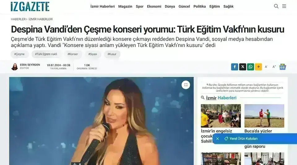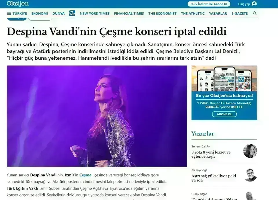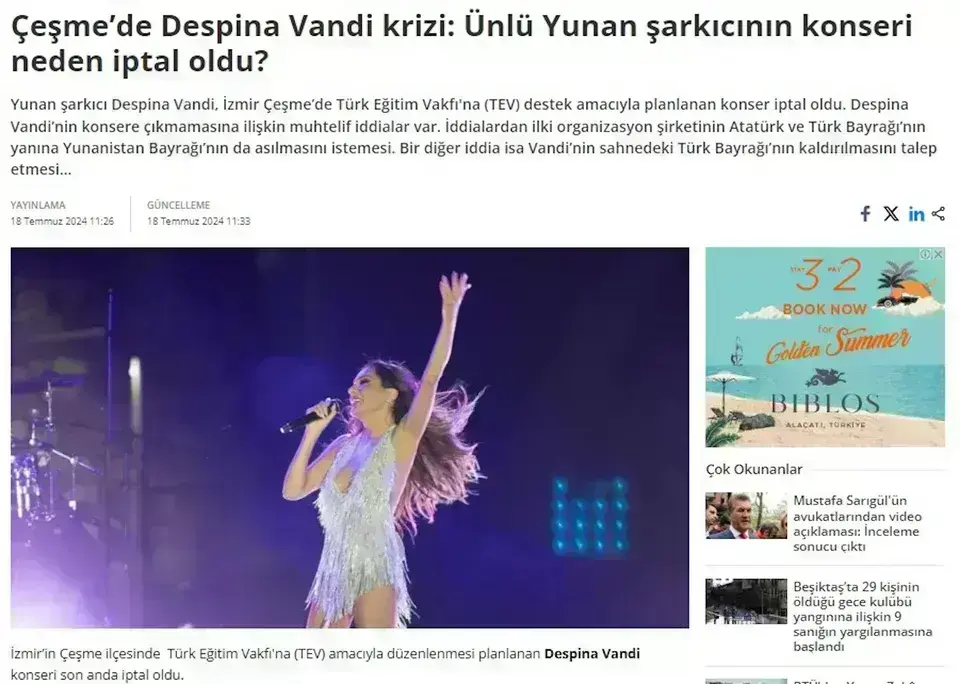 «Όταν είδε την τουρκική σημαία… Ακυρώθηκε η συναυλία της Ελληνίδας τραγουδίστριας Δέσποινας Βανδή στην περιοχή Τσεσμέ της Σμύρνης, επειδή φέρεται να απαίτησε να κατέβουν η τουρκική σημαία και η αφίσα του Ατατούρκ στη σκηνή».