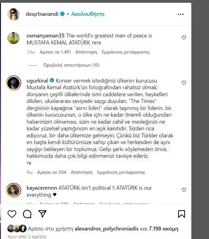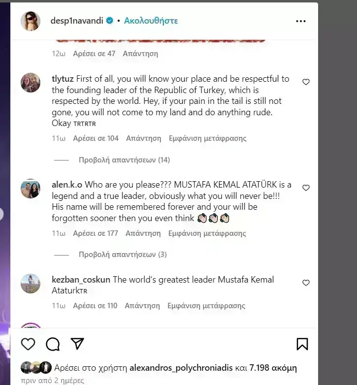«Ποια είσαι παρακαλώ;;; Ο Μουσταφά Κεμάλ Ατατούρκ είναι ένας θρύλος και ένας αληθινός ηγέτης, προφανώς αυτό που δεν θα γίνεις ποτέ!!!»