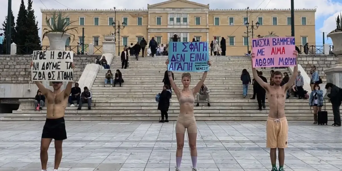 Οι βίγκαν ακτιβιστές συγκεντρώθηκαν στην πλατεία Συντάγματος, κρατώντας πλακάτ με μηνύματα όπως «Η σφαγή δεν είναι αγάπη» και «Ήρθε η ώρα να δούμε τα ζώα ως άτομα», προσελκύοντας το ενδιαφέρον των περαστικών που έκαναν την κυριακάτικη βόλτα τους.
