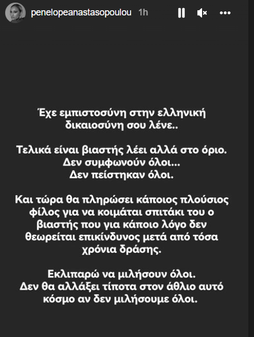 Η ηθοποιός, Πηνελόπη Αναστασοπούλου, που κατήγγειλε επώνυμα τον Πέτρο Φιλιππίδη για σεξουαλική παρενόχληση, έγραψε χαρακτηριστικά: «Έχε εμπιστοσύνη στην ελληνική Δικαιοσύνη σου λένε. Τελικά είναι βιαστής λέει αλλά στο όριο. Δεν συμφωνούν όλοι. Δεν πείστηκαν όλοι. Και τώρα θα πληρώσει κάποιος πλούσιος φίλος για να κοιμάται σπιτάκι του ο βιαστής που για κάποιο λόγο δεν θεωρείται επικίνδυνος μετά από τόσα χρόνια δράσης. Εκλιπαρώ να μιλήσουν όλοι. Δεν θα αλλάξει τίποτα στον άθλιο αυτό κόσμο αν δεν μιλήσουμε όλοι».