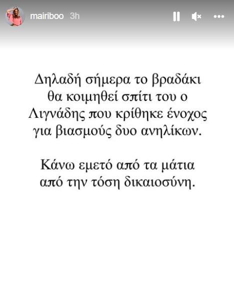 Η Μαίρη Συνατσάκη ξέσπασε μέσω instagram: «Δηλαδή σήμερα το βραδάκι θα κοιμηθεί σπίτι του ο Λιγνάδης που κρίθηκε ένοχος για βιασμούς δυο ανηλίκων. Κάνω εμετό από τα μάτια από την τόση δικαιοσύνη».