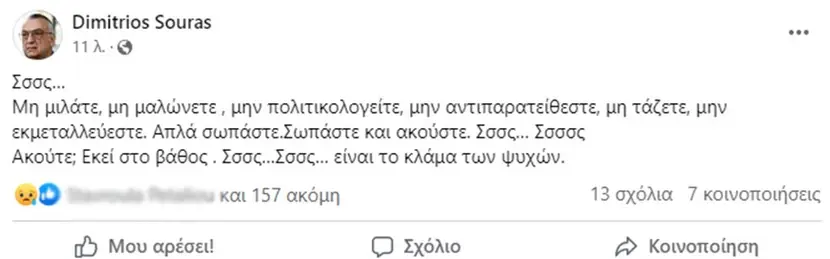«Σσσς… Μη μιλάτε, μη μαλώνετε , μην πολιτικολογείτε, μην αντιπαρατείθεστε, μη τάζετε, μην εκμεταλλεύεστε. Απλά σωπάστε. Σωπάστε και ακούστε. Σσσς… Σσσσς» έγραψε ο Δημήτρης Σούρας.
